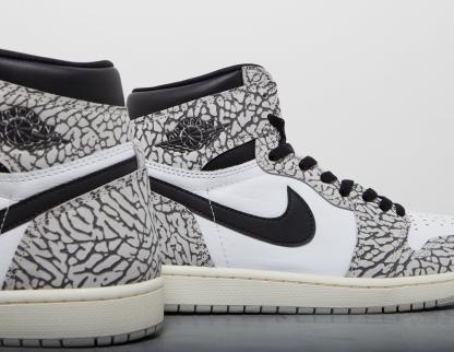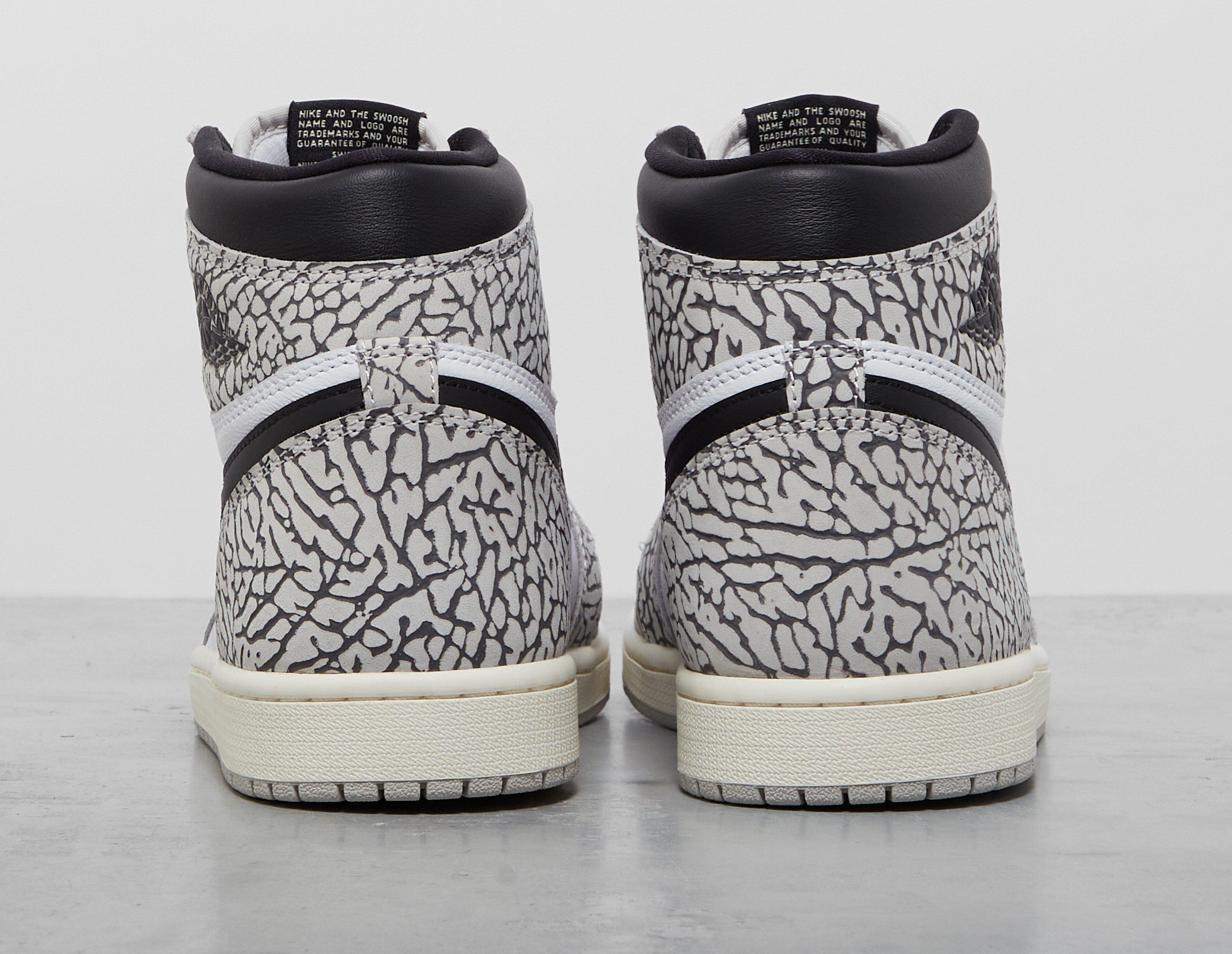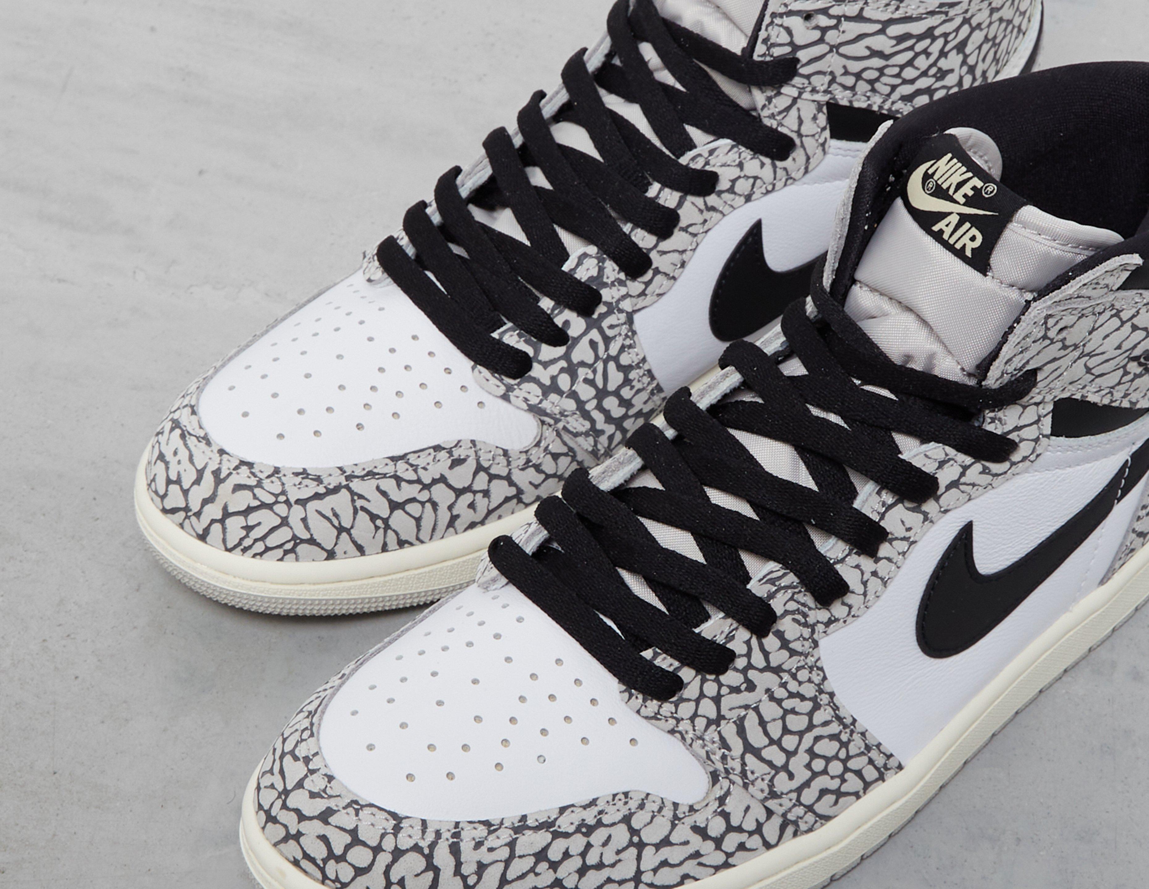 Here we see the shoe done up in a makeup famously linked to another Jordan silhouette. The Air Jordan 1 Retro High OG 'White Cement' is fitted with elephant print overlays, instantly reminiscent of the Air Jordan 3's famously textured detailing. A white leather base and black accents are also utilised through the uppers, with Wings, Swooshes, laces and collar bringing a darker contrast to the rest of the shoe. Ventilation is supplied by perforations at the toe, and the midsole houses plenty of Air technology for plush cushioning underfoot. Completing the build is a grippy rubber outsole, ideal for optimizing gameplay and supplying a steady stride. | DZ5485-052