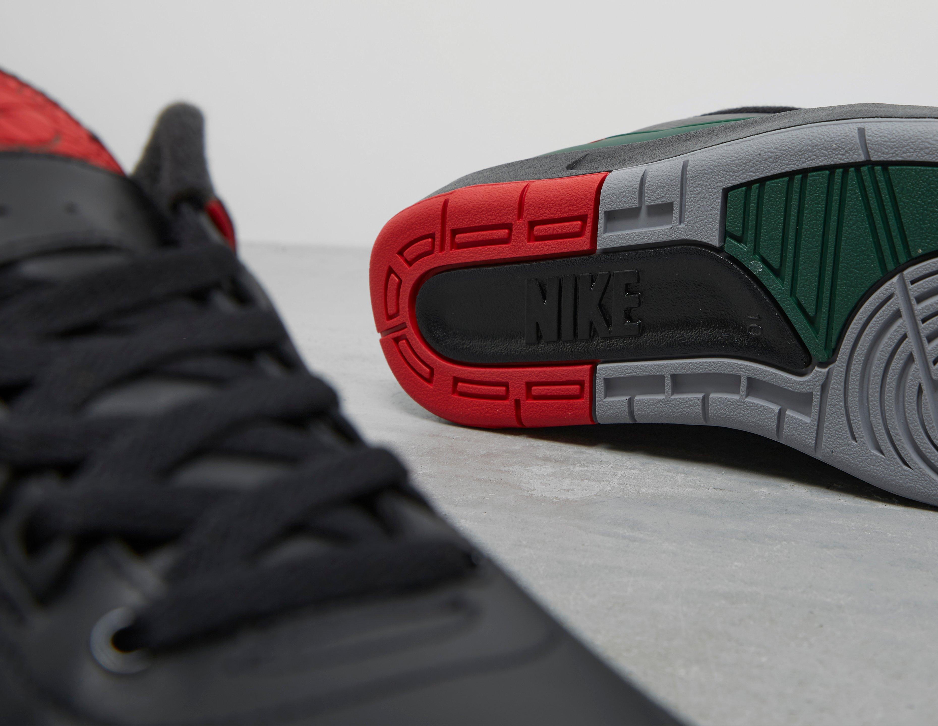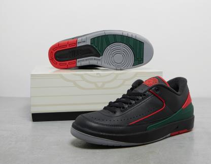 Just in time for the festive season, Jordan looks back on its heritage and celebrates Italy, where the AJ2 was first designed in '86. Taking its lead from "il Tricolore", or the Italian flag, the premium black tumbled leather upper and 'Iguana' print is accented with 'Fire Red' and 'Fir' at the heel counter. Red piping and Jordan insignia pick up the theme, which happily coincides with the holidays. Underfoot, a black midsole is met by a red, green and grey grippy outsole, further tying the silhouette to its origins. | DV9956-006