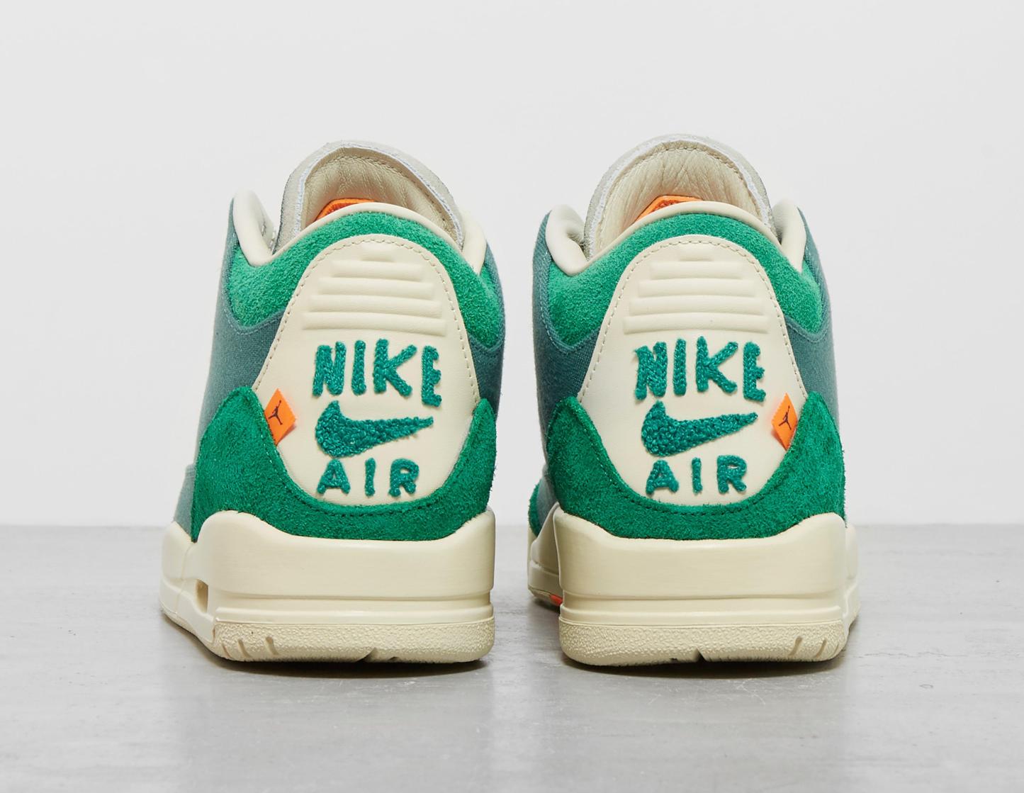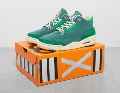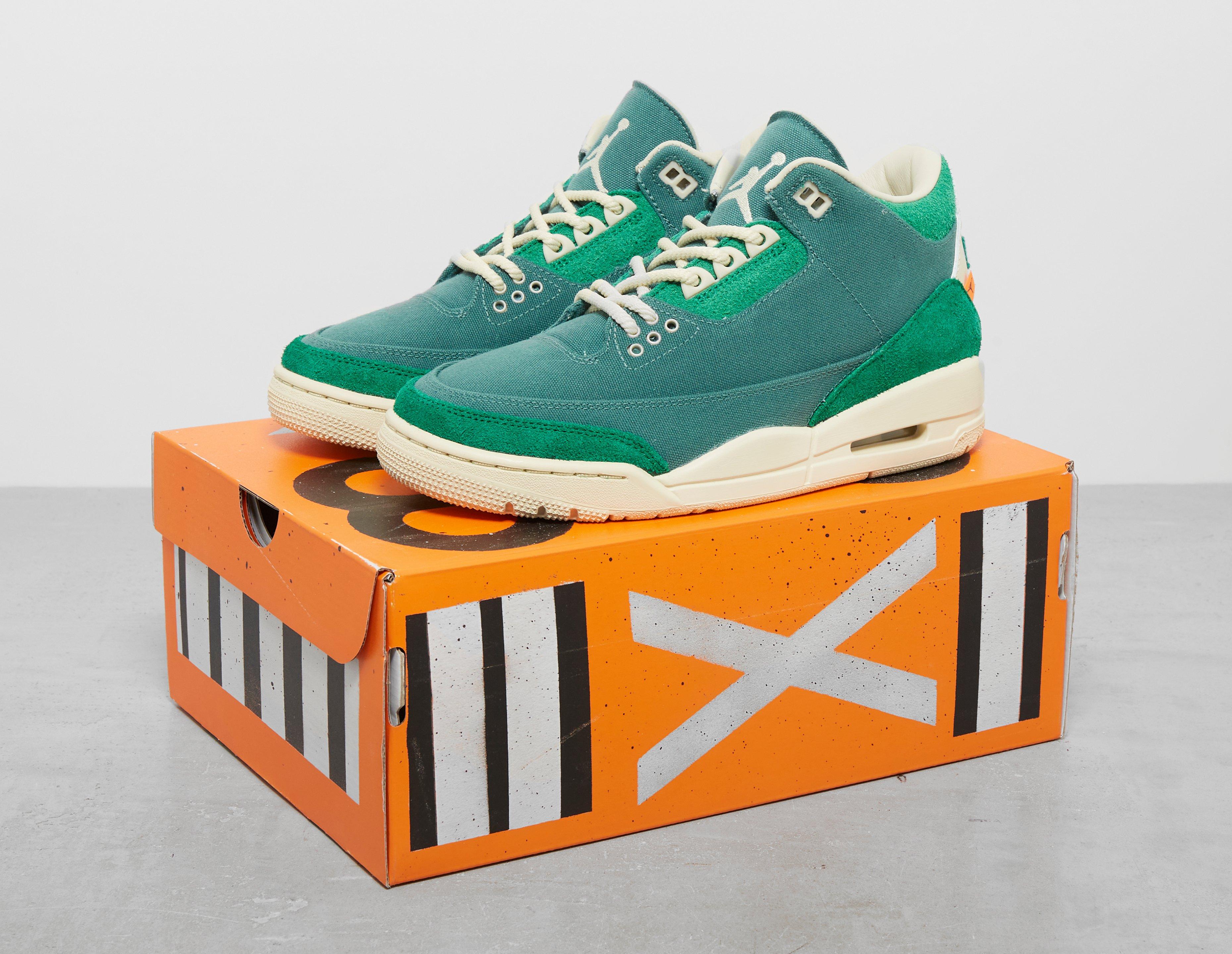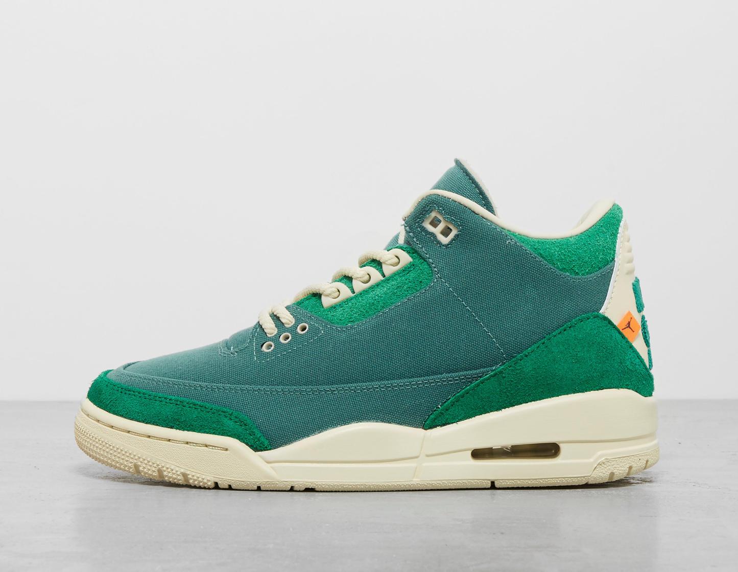 NYC-based contemporary artist, Nina Chanel Abney, is known for combining representation and abstraction to capture contemporary culture. Following on from 2022s duo of Air Jordan 2, Abney has joined the Jumpman label once again to put her unique spin on the Air Jordan 3. Replacing the traditional tumbled leather is Bicoastal waxed canvas and hairy suede overlays in Malachite green. Underfoot, an off-white midsole encapsulates the visible Air unit with flashes of colour catching the eye on the outsole. Jumpman and Nike Air branding have been reimagined in Abneys signature style and a special orange checkerboard insole adds the final flourish. | FZ7974-300