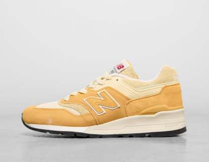 Teddy Santis presents the Made in USA Collection for Fall/Winter '25 with the welcome return of the lauded 997. Here, the silhouette is dressed in sunny shades of 'Dried Apricot' and 'Calcium' with touches of white with a rich array of textures, from hairy suede on the collar and tongue to soft, buttery pig suede and mesh on the upper. TPU reinforces the sidewall, while 'N' branding nods to heritage and underfoot, the wedged midsole delivers that signature New Balance comfort. | U997AC