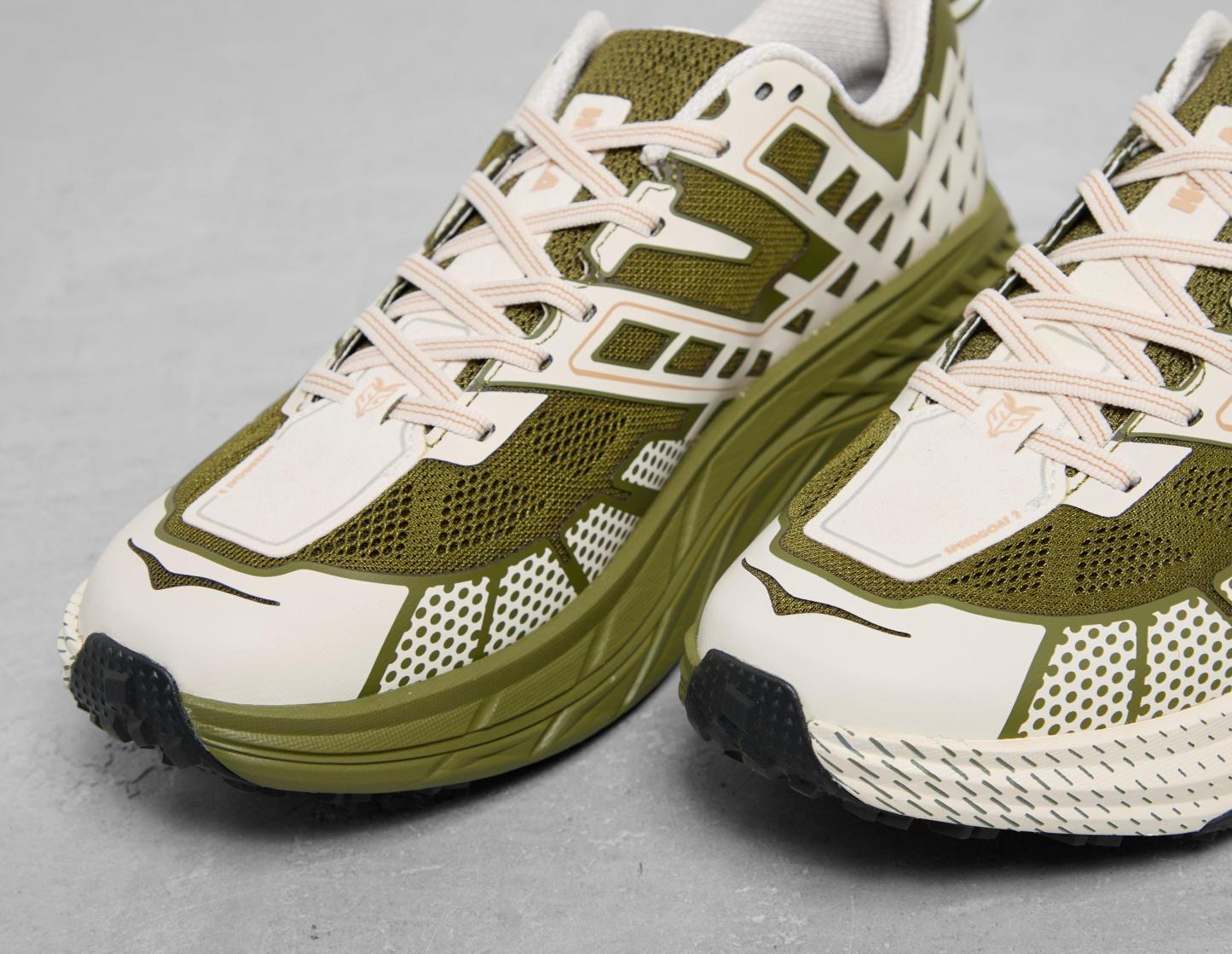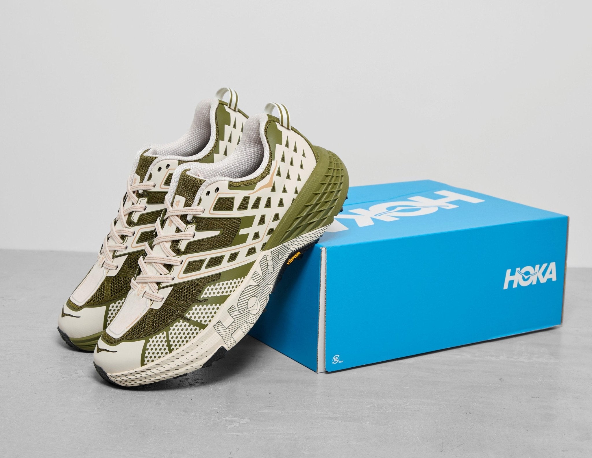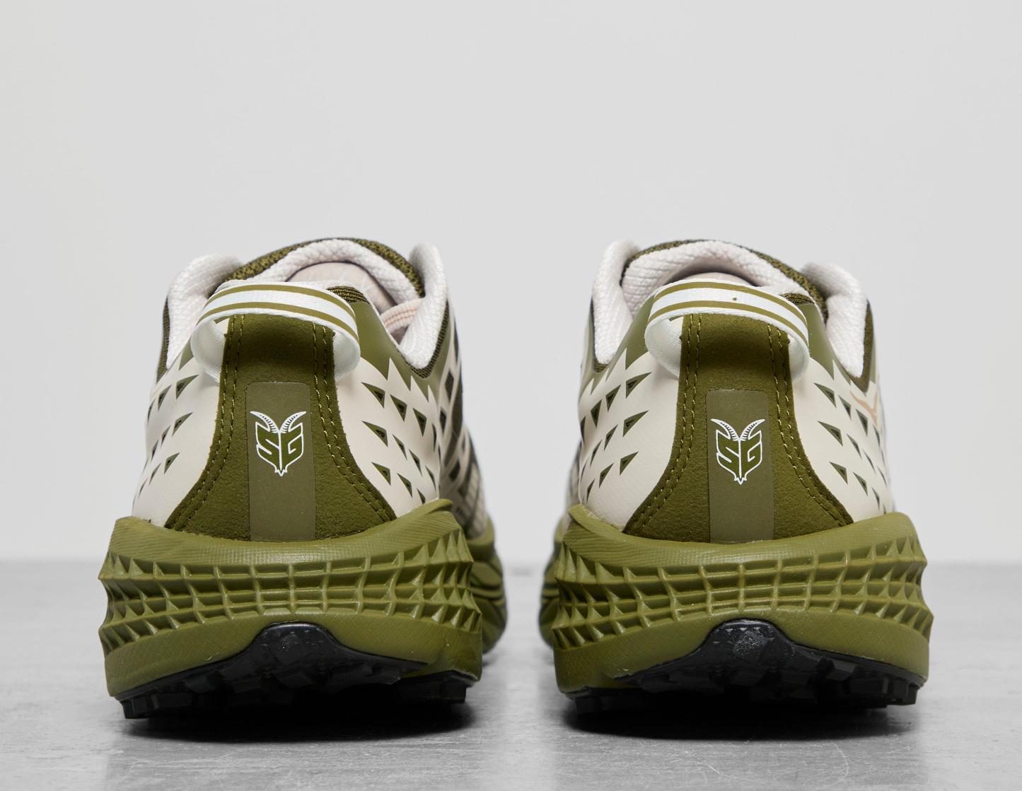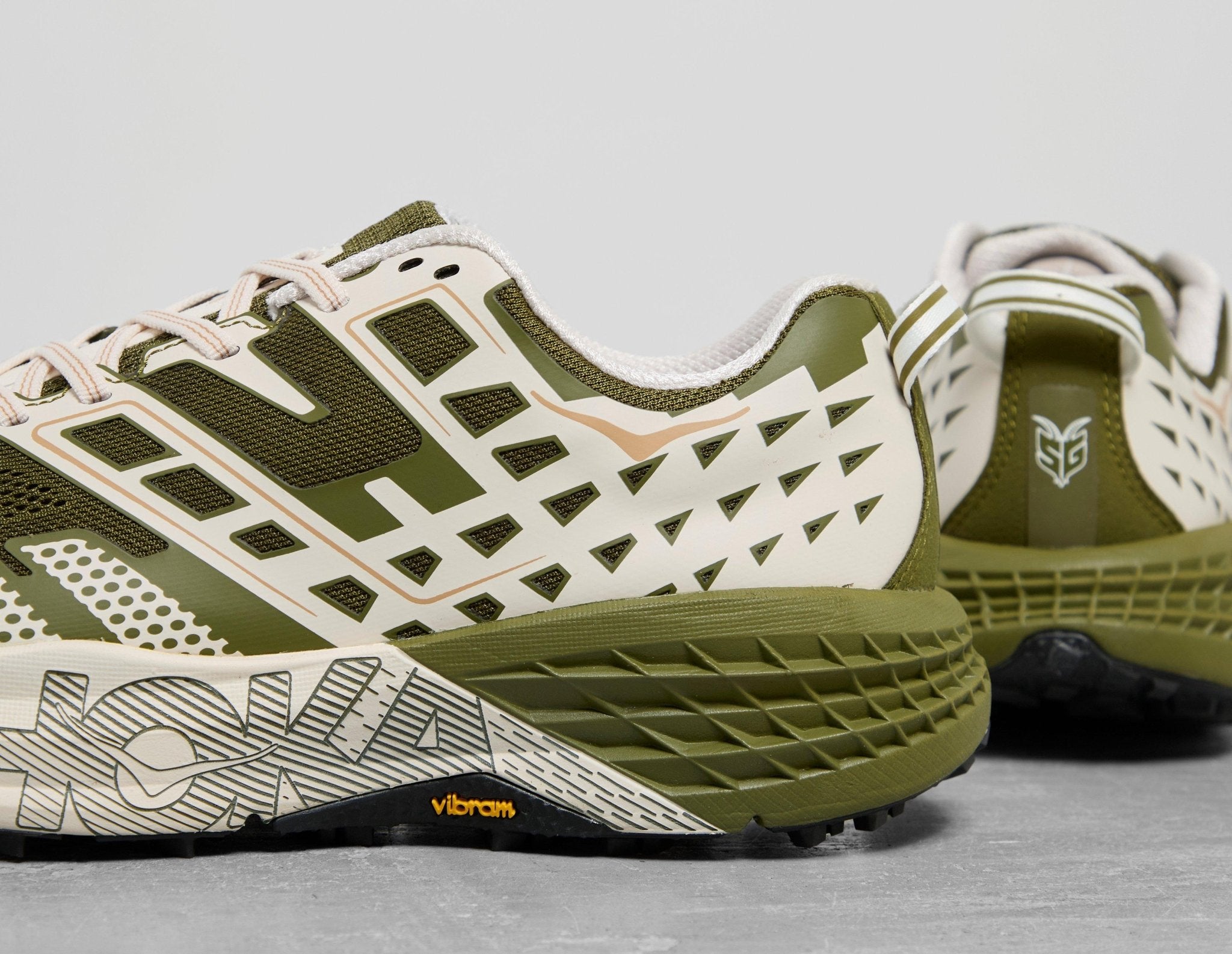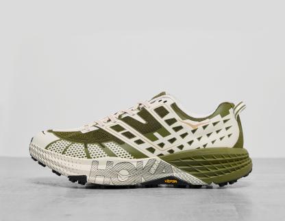 HOKA looks to its archive to revive the pinnacle of trail runners, the Speedgoat 2, for the lifestyle space. Maintaining its original silhouette, the 'Moss Green' and 'Rose Cream' engineered mesh upper is layered with a geometrically detailed protective overlay. Underfoot, a Vibram Megagrip outsole ensures stability across a multitude of terrains, while original Speedgoat and HOKA logos nod to heritage. | 1162710-MRSC