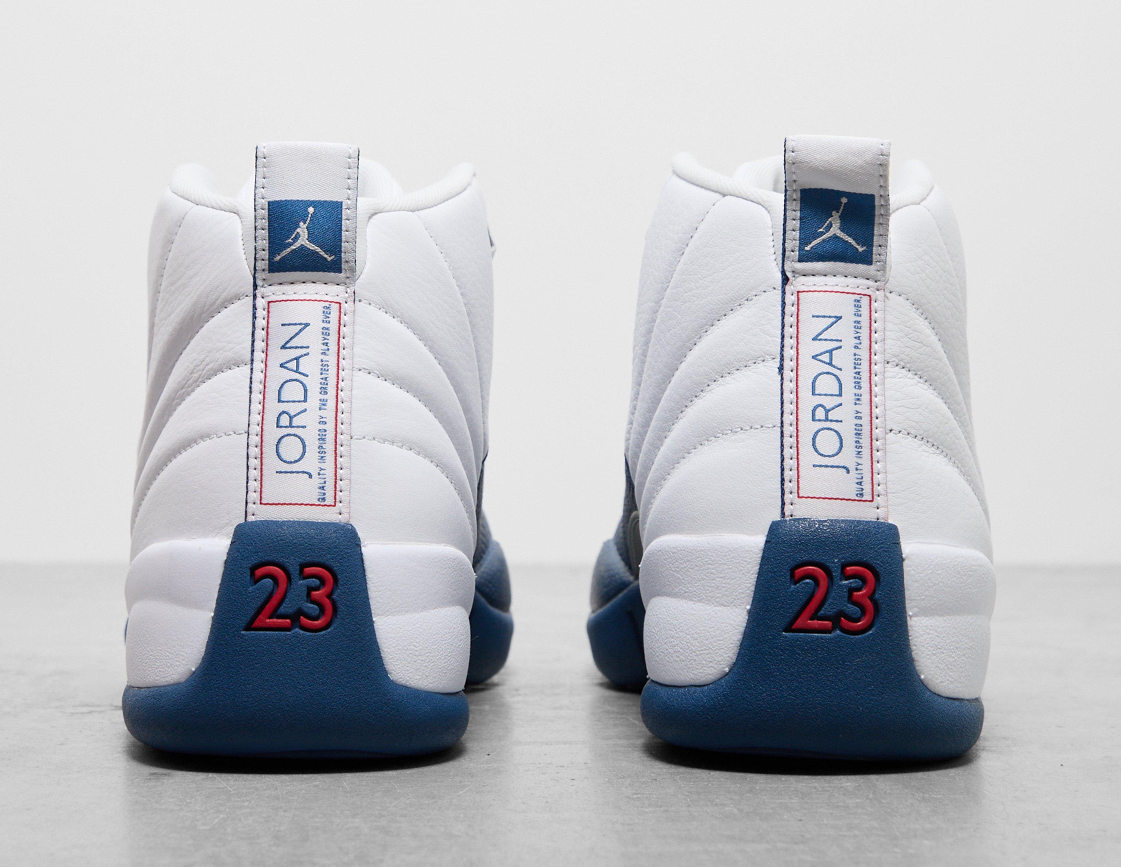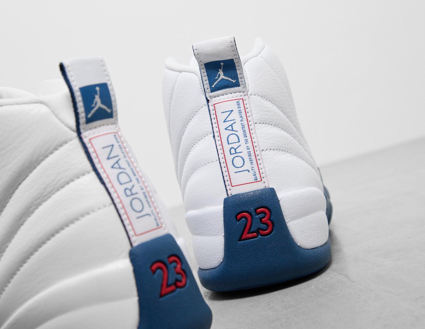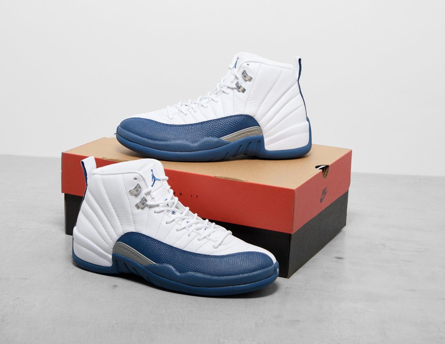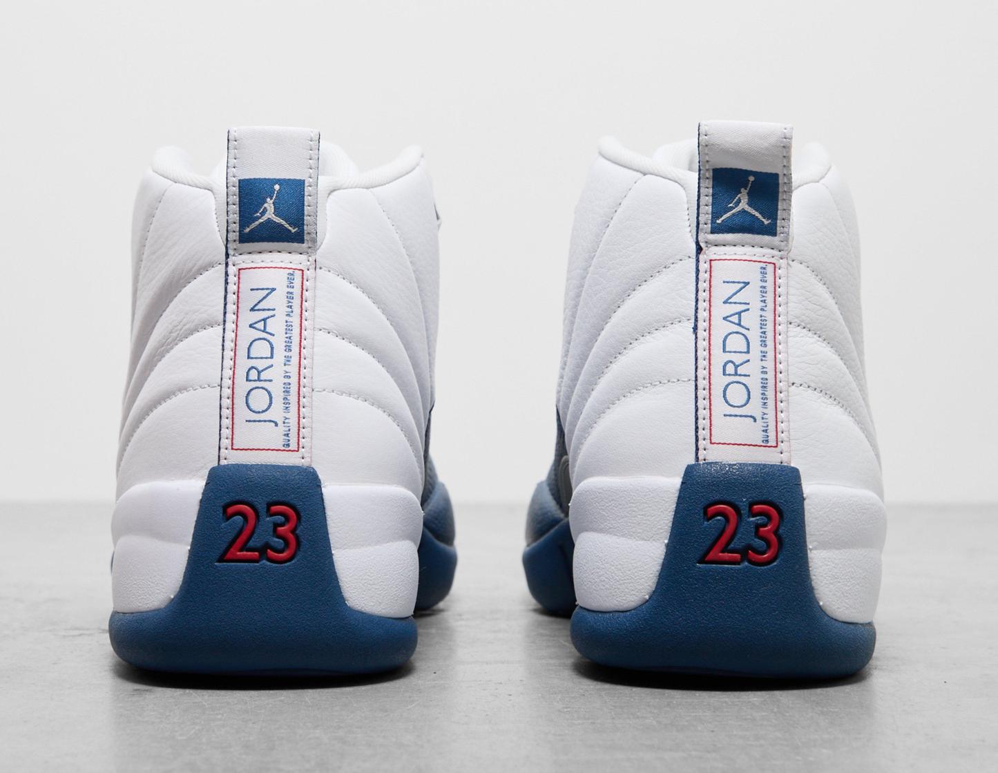Designed in '96 by Tinker Hatfield, the Air Jordan 12 was the first in the Jordan line-up to feature Air Zoom cushioning, and now, for the first time in 10 years, this 2004 retro arrives in its 'French Blue' format. White tumbled leather curves across the upper, maintaining its sunrise-inspired stitching, while the 'French Blue' pebbled leather adds the perfect contrast. 'Silver Metallic' and 'Varsity Red' detailing add the finishing touches across the design, while the famed Air Zoom sole unit ensures signature Jordan cushioning and stability. | CT8013-114