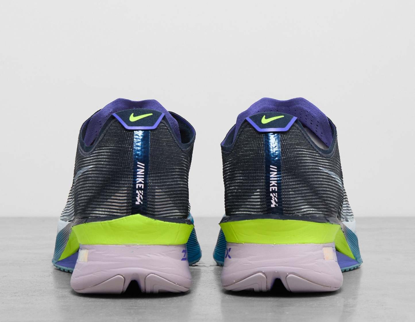 Nike's Vaporfly 4 puts speed first, as the lightest Vaporfly model yet, the engineered mesh upper provides improved comfort, a consistent fit and a barely there on-foot feeling. Arriving in 'Obsidian' with touches of 'Persian Violet' and 'Green Abyss', this design has a higher angle than its predecessor. The carbon-fibre Flyplate is combined with a lower heel-to-toe drop height to offer improved propulsion and speed, while the ZoomX foam weight has been reduced for even more bounce. Grounding the design is a thinner rubber outsole that gives you the same reliable traction with even less weight. | HF6414-401